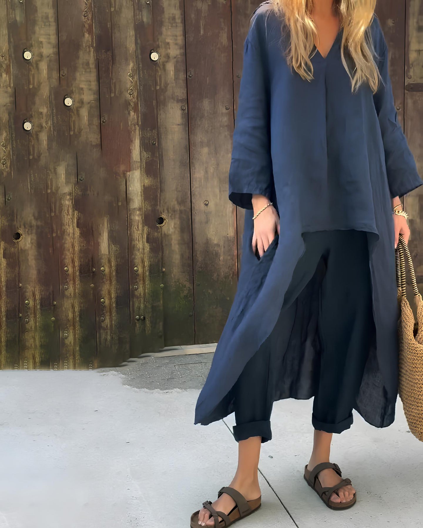 Szeretnéd elkerülni a ruházati stresszt, de mégis stílusosan akarsz kinézni? Az Alma szett egy két részes öltözet, amely azonnal csinos és magabiztos megjelenést biztosít számodra a gardróbból. Könnyű és lélegző anyagból készült, és úgy van tervezve, hogy előnyösen hulljon a testen – tökéletes brunchra, ügyintézésre vagy esti programokra.
